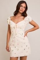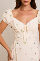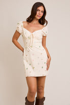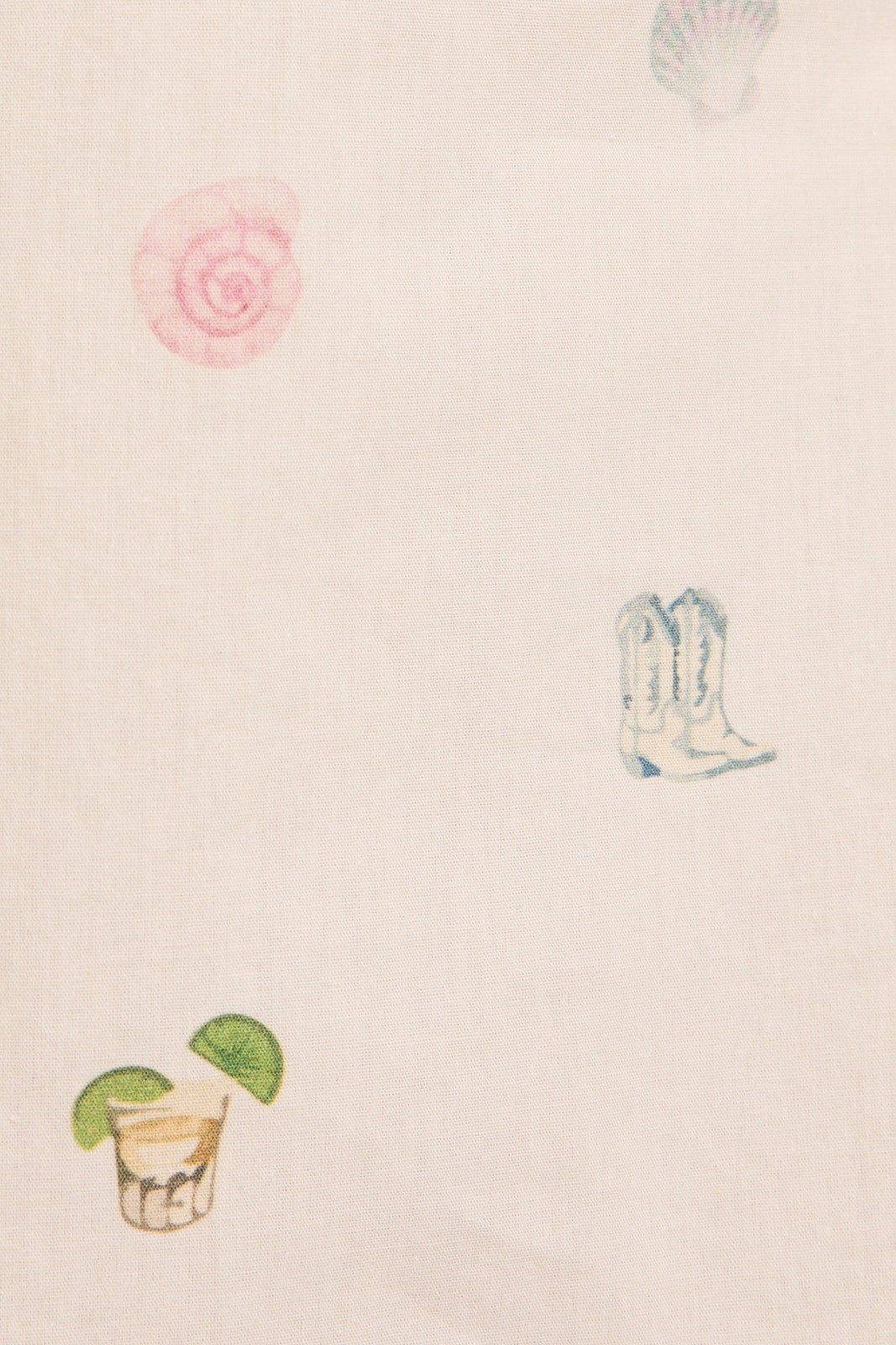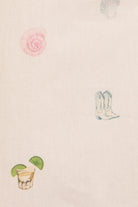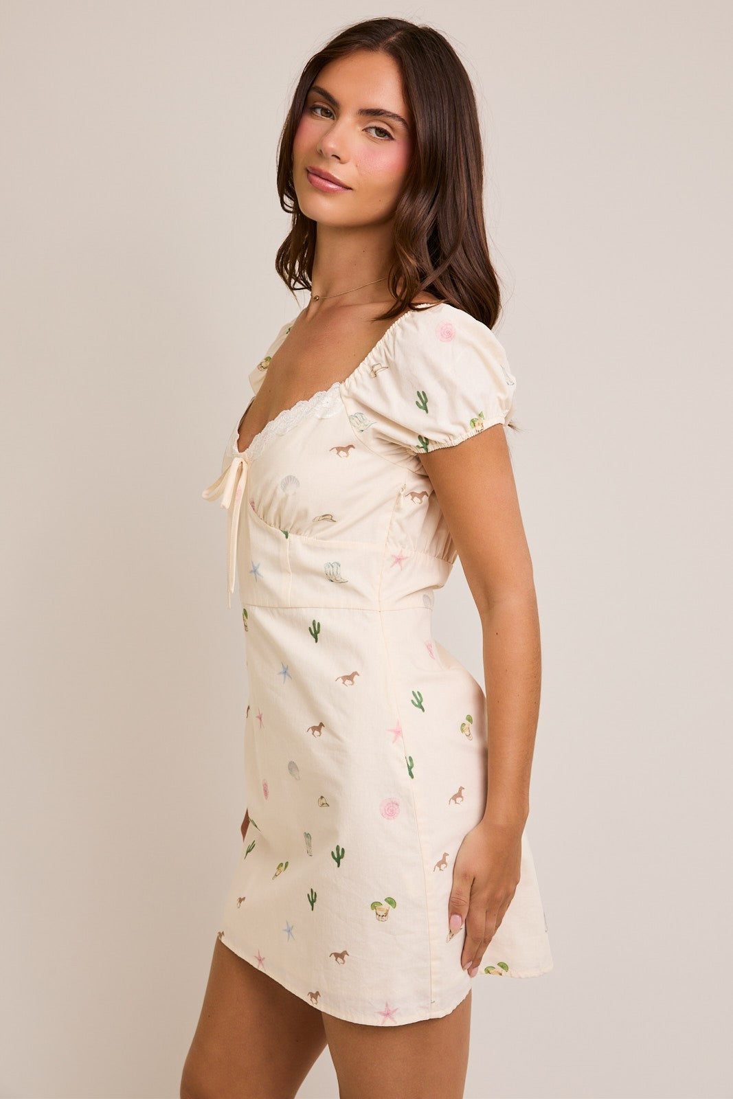 Saddle up in the sweetest fusion of western charm and coastal flair. The Rodeo Romance Mini Dress is a flirty cotton mini designed with a novelty print that celebrates sunshine, sea shells, cacti, cocktails, and cowboy boots. Featuring a sweetheart neckline with dainty lace trim and a tie-front bust, this dress flatters with its fitted bodice and puff sleeves. Finished with a square back and a soft A-line silhouette, it’s perfect for beachside strolls, boot-scootin’ nights, and everything in between.
