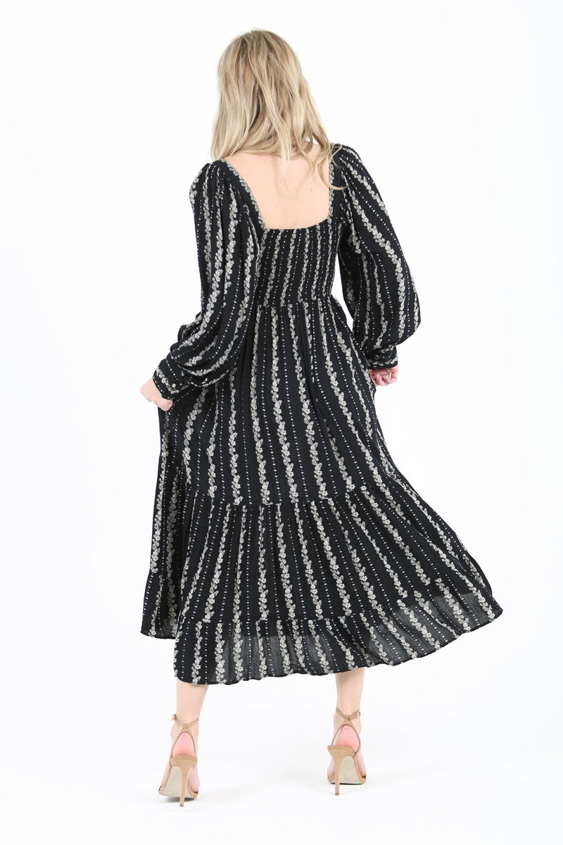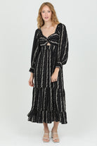 - A flowy floral maxi made to turn every step into a moment. The twist front detail and flirty cutout create a flattering shape while the long sleeves and tiered skirt bring breezy movement. A chic go to for dinner dates, winery days, and everything in between.