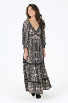 A neutral snake pattern maxi dress designed for effortless movement and year round wear. The twist front bust detail highlights the waist while long sleeves and a tiered skirt create a soft, flattering silhouette. Wearable, bold, and beautifully timeless.