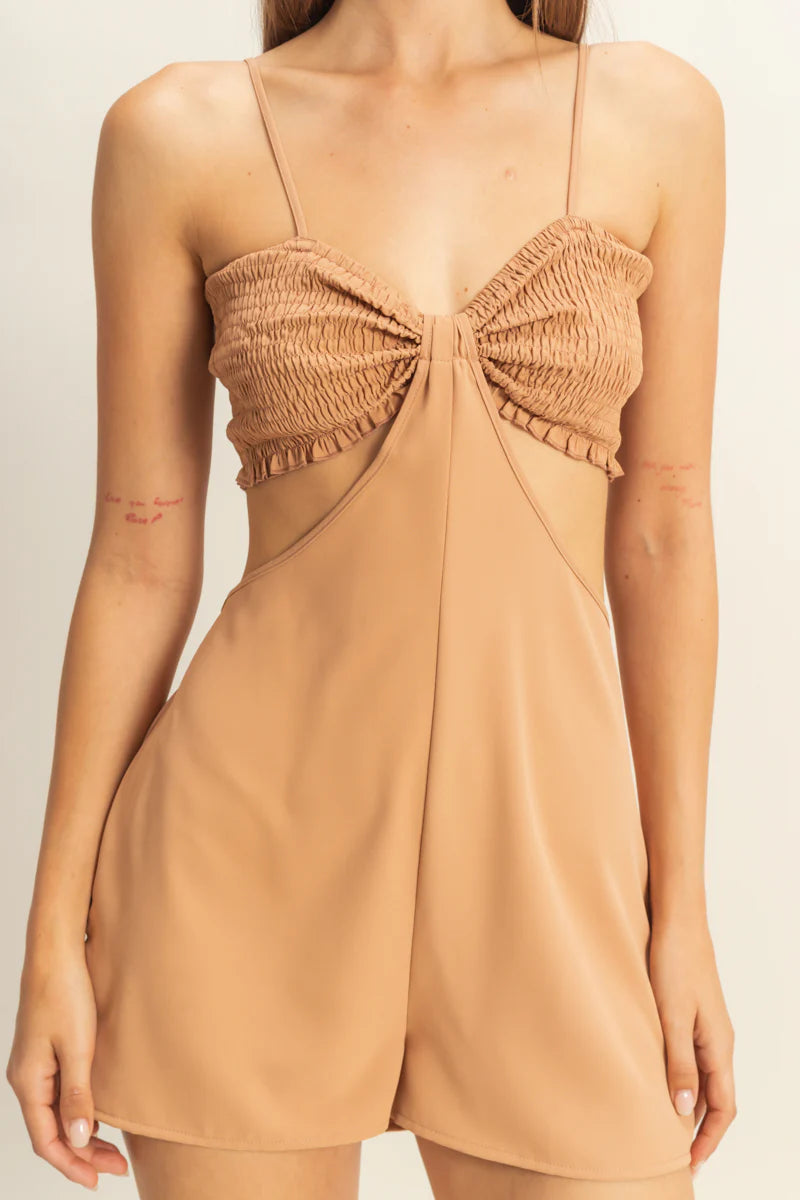 Easy, effortless, and so flattering. The Golden Drift Romper features a ruched sweetheart neckline, smocked bodice, cutout waist, and breezy shorts—made for golden days and warm nights.