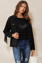 A bold layering piece that steals the spotlight. This black denim shacket brings western-inspired fringe to the next level with silver stud accents, a raw hem, and an oversized silhouette.