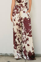 The Ranch Ready Wide Leg Pants are a bold statement piece with a modern western edge. Designed in a cow print satin finish with a flowy silhouette, they’re perfect for pairing with heels or boots for a head-turning look.