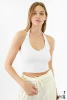 A ribbed knit halter top with a dreamy V-neckline, sleeveless cut, and open back. Made from ultra-stretchy seamless fabric, it’s your go-to for sunny days or effortless layering.