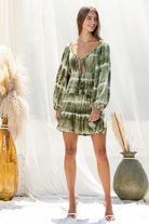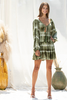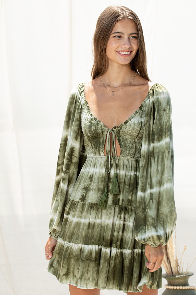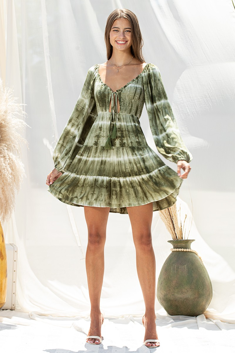 The Green Horizons Mini Dress captures effortless fall style in a rich olive tie dye. Featuring a flattering smocked bodice, soft sweetheart neckline, and flowy tiered skirt, it moves with ease and charm. Long bishop sleeves add a romantic touch, while the tasseled front tie brings a playful boho vibe.